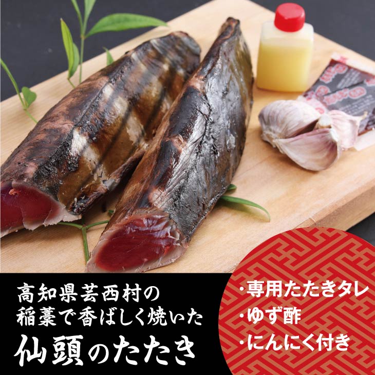 よくある質問(Q&A)はこちら 【芸西村と大川村の共通返礼品】 芸西村仙頭のたたき&大川村土佐はちきん地鶏モモ肉セット 名称 仙頭のたたき 用途 刺身 産地 高知県 内容/内容量 かつおたたき/片身、ゆず果汁/30g、たたきタレ/15cc 8袋、にんにく/約1玉(高知県産)※にんにくの玉が季節的になくなるとにんにく葉に変更になります。