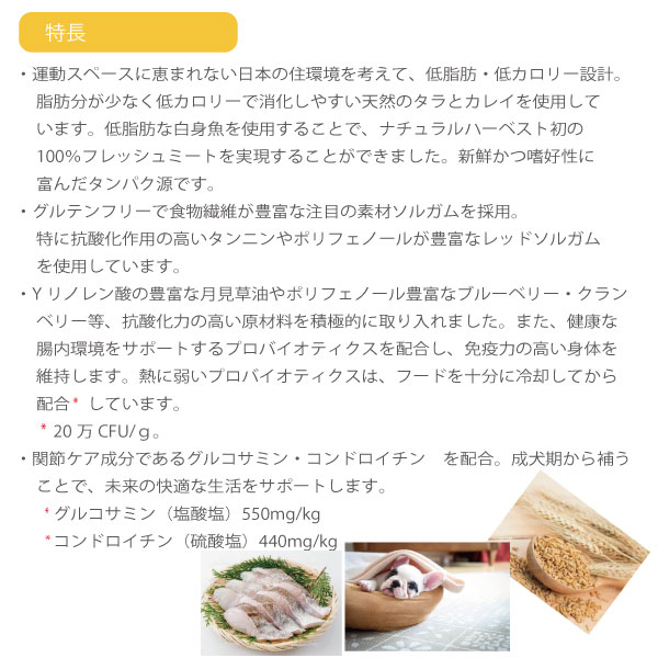 商品名 ナチュラルハーベスト ベーシックフォーミュラ メンテナンススモール フィッシュ 1.59kg×4袋 商品説明 白身魚とソルガムを使ったフード。